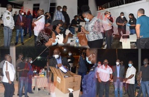De voorzitter van het Covid-19 coördinatieteam KPS (CCT-KPS), de commissaris van politie Seedorf. H, heeft de minister van Justitie en Politie, K. Amoksi; de voorzitter van De Nationale Assemblee (DNA) M. Bee en de parlementaire covid-19 crisis commissie rondgeleid op drie verschillende locaties.