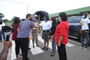 Woensdag 16 juni 2021 – In het kader van het project “Landelijke distributie van voedselpakketten” van de regering, heeft minister Krishna Mathoera van Defensie samen met minister Rishma Kuldipsingh van Arbeid, Werkgelegenheid en Jeugdzaken een aantal sociale instellingen bezocht in Nieuw-Nickerie. Samen met de districtscommissaris (dc) van Nickerie, Senrita Gobardhan en de coördinator van het project Stanley Dijksteel hebben de bewindslieden op dinsdag 15 juni 2021 de instellingen aangedaan. Beide ministers overhandigden voedselpakketten aan de leidinggevenden van de diverse instellingen.